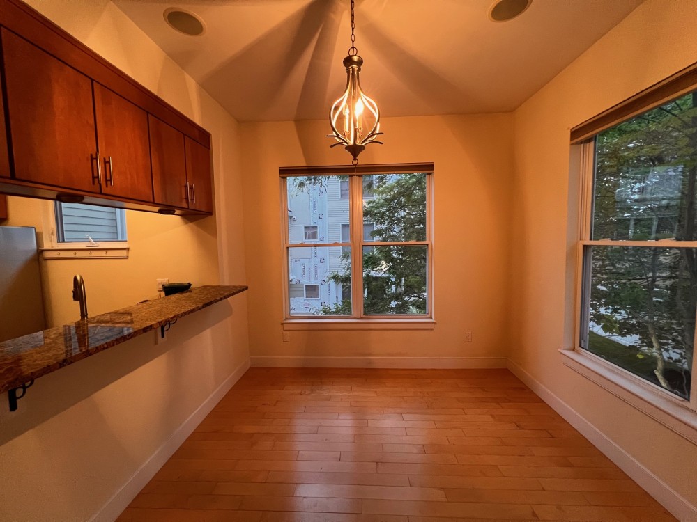 Beautiful light-filled second floor corner unit with fabulous open floor plan. Kitchen has granite counters, stainless steel appliances and breakfast bar. The sunny corner area can be used for dining, or for your favoirte chair to curl up with a good book to read! French doors lead to a lovely balcony. There are hardwood floors throughout, central air, in unit laundry, private balcony, and garage parking. Cats considered with references.